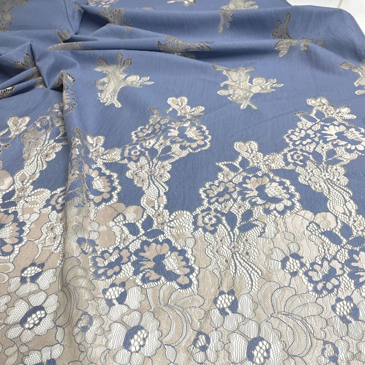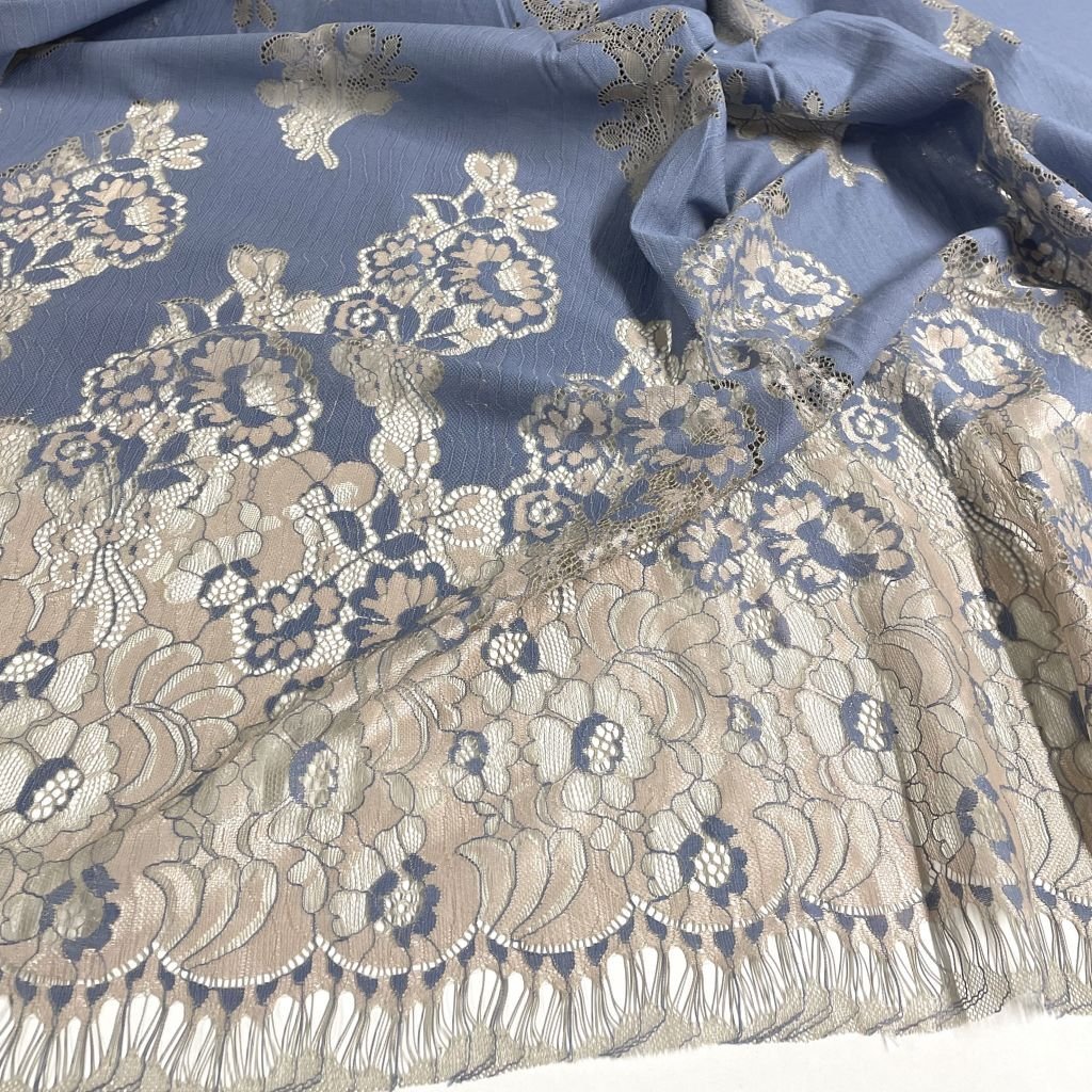 Кружевное полотно выполнено в очень интересной технике - кружевные фрагменты «вживлены» в основное тканевое полотно. Создается впечатление, как будто кружево проглядывает сквозь основную ткань, создавая загадочный и романтичный образ. Ткань выполнена в виде купонов, с фестонами в верху и внизу купона - размер купона 150х155см. Имеется небольшой брак.